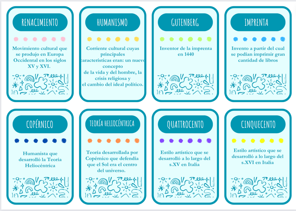 Tarjetas con las definiciones de los conceptos más importantes del Renacimiento. Está pensado para Geografía e Historia de 2º ESO pero se puede adaptar a otros niveles educativos.